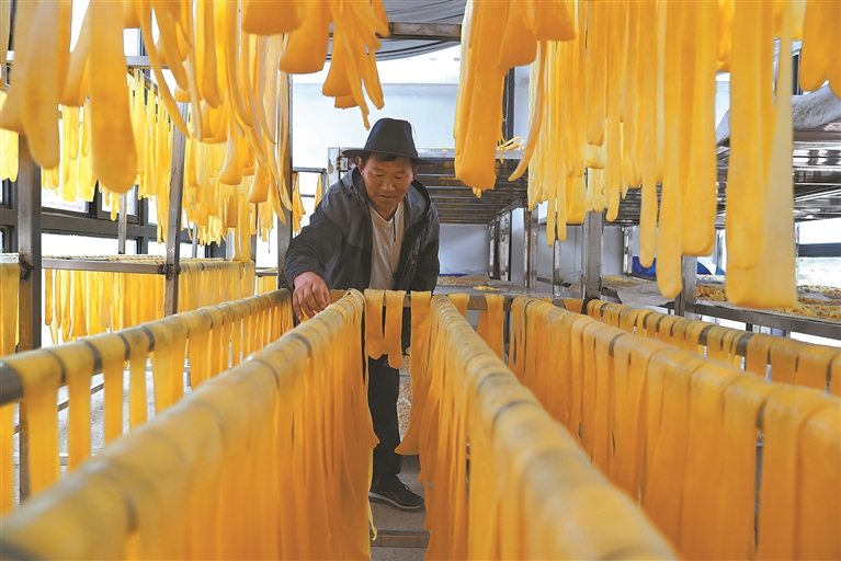 左图:那曲市嘉黎县麦地卡乡的牧民在合作社车间晾晒奶制品“拉拉”。