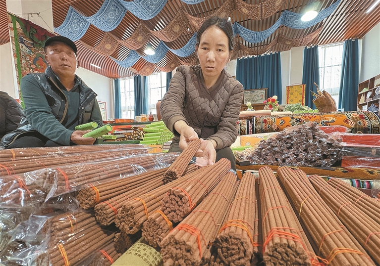 上图:昌都市贡觉县堤无玛艺术传承专业合作社的员工在包装藏香。
