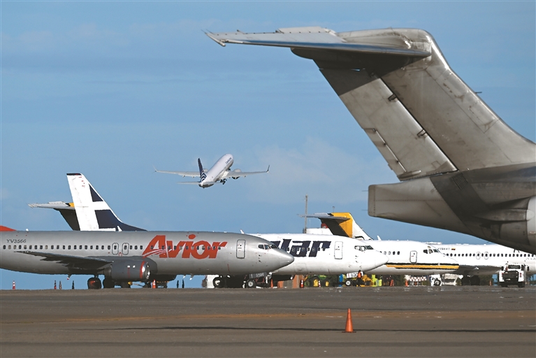 图为12月3日,一架巴拿马航空公司客机从委内瑞拉加拉加斯附近的迈克蒂亚西蒙·玻利瓦尔国际机场起飞。新华社记者 李木子 摄