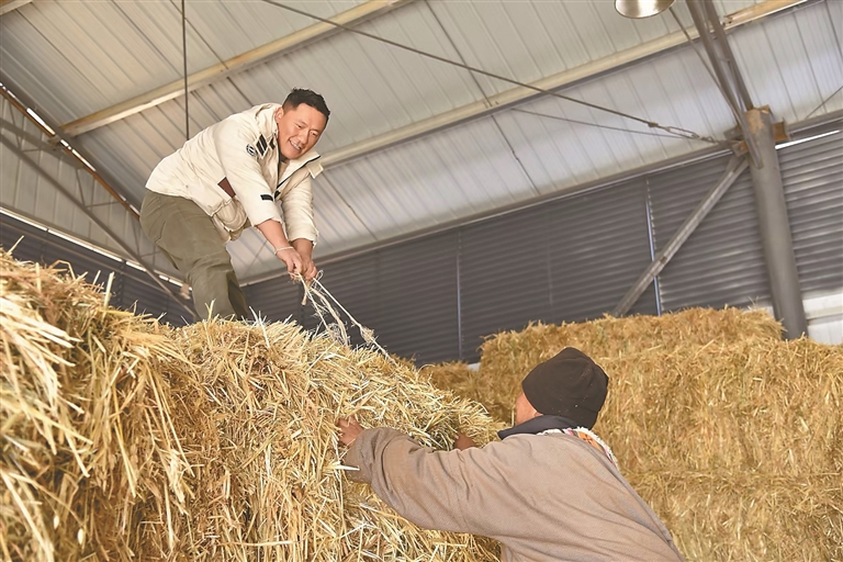 图为热达与同事整理冬储饲草。青海日报记者 余晖 摄