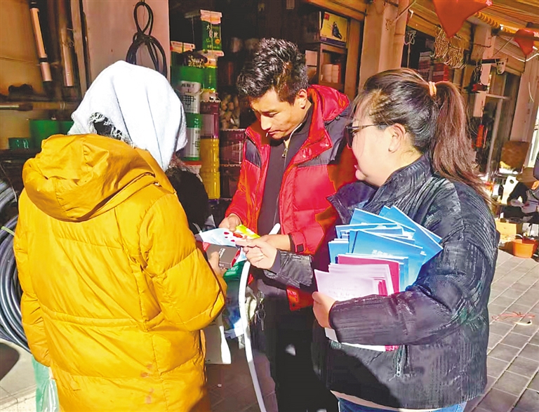 左图:墨竹工卡县群团工作部妇联工作人员走进商户发放反家庭暴力宣传手册。
