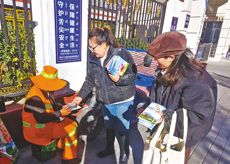 上图:墨竹工卡县群团工作部妇联工作人员向环卫工人发放反家庭暴力宣传手册。