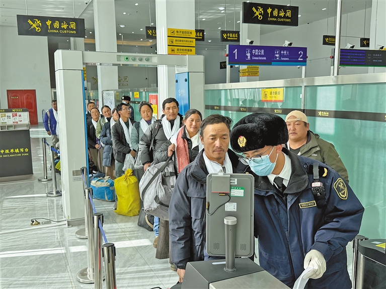 图为拉萨海关所属日喀则海关关员在里孜口岸开展监管查验工作,确保旅客入境顺畅。