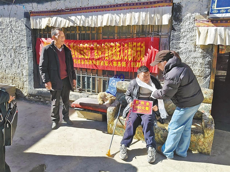 图为措美县残联工作人员为身患残疾的村民送去慰问金及生活用品。