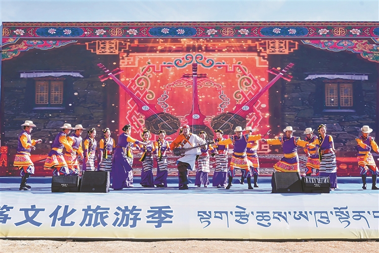 活动首日,主舞台演艺区举行开幕式。舞台设计巧妙融合“云上达孜”概念与风筝造型元素,背景LED大屏以非遗风筝为主,两侧配以达孜山水纹样装饰,20座藏式帐篷包厢环绕观众席,尽显浓郁的民族风情。藏戏《吉祥》率先登场,华丽的服饰与精湛的表演再现传统民俗魅力;西藏自治区歌舞团团长旦增的深情演唱与歌手格桑玉珍嘹亮动人的歌喉,赢得现场观众阵阵喝彩;舞蹈《鲁古白琼》《欢腾的弦子》将藏族人民的热情豪迈展现得淋漓尽致,台下观众随之击节附和,更有不少人起身加入舞蹈队伍。最为动人的是二重唱《云上达孜》,LED大屏交替闪现达孜区60年变迁——从土路到柏油路、从毡房到藏式楼房、从手工劳作到产业兴旺,让不少达孜群众感慨万分。