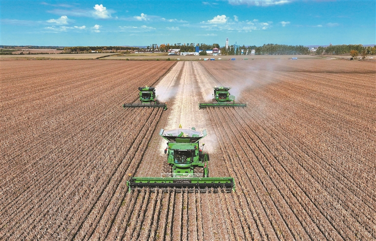 图为9月29日,在北大荒集团黑龙江尾山农场有限公司第一管理区,农机进行大豆收获作业(无人机照片)。