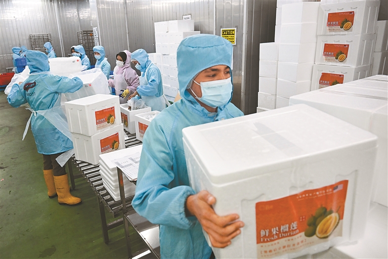 图为2025年10月16日,在马来西亚雪兰莪州的一家榴莲加工厂,工作人员将封装好的榴莲搬运至恒温冷链车,准备运往吉隆坡国际机场,销往中国市场。新华社记者 程一恒 摄