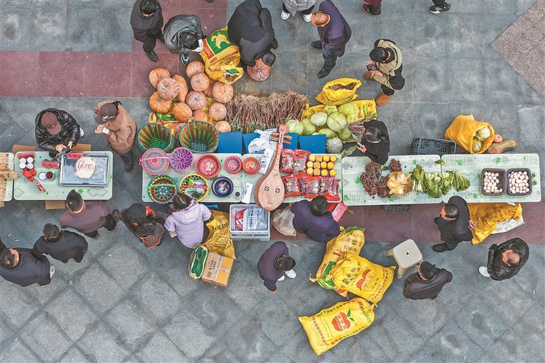 集市上,来自乡村的优质土特产集中亮相,吸引众多居民前来品尝、选购。