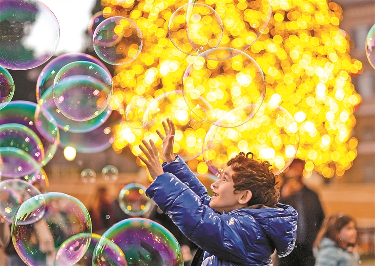 近日,意大利罗马的主要地标建筑和市中心街道点亮节日彩灯,为冬日增添缤纷色彩。图为小朋友在意大利首都罗马的人民广场玩泡泡(12月13日摄)。新华社记者 李京 摄