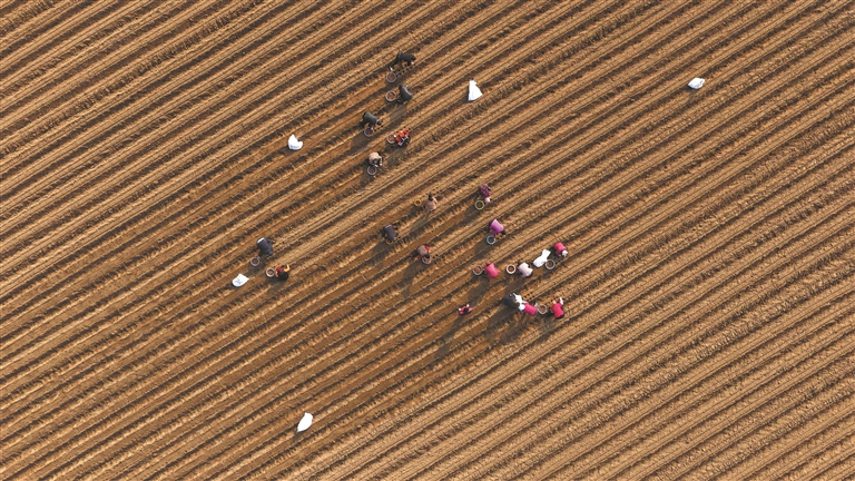 图①:12月16日,在山东省聊城市茌平区贾寨镇,农民在田间种植中药材玄参(无人机照片)。新华社发(赵玉国 摄)