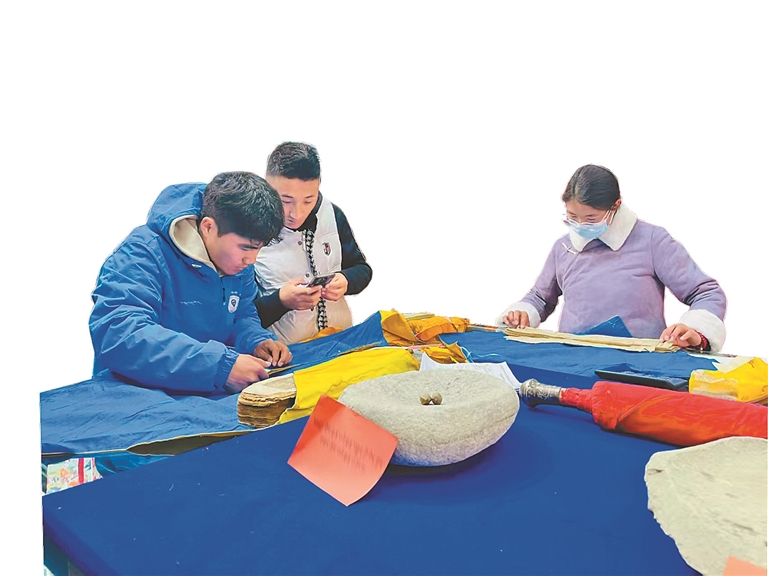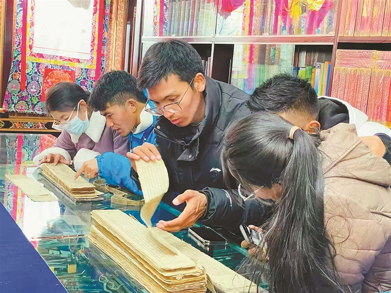 图③:学生在藏医展馆翻阅藏医药技艺配方。