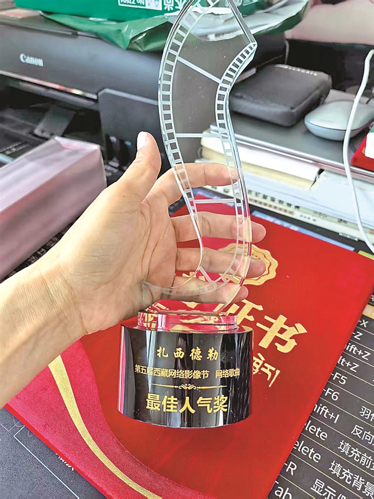 图①:徐佳创作和演唱的作品《你就是我我就是你》荣获第五届西藏网络影像节网络歌曲单元最佳人气奖(奖杯)。