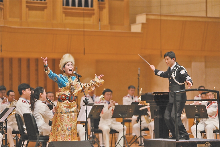 图④:徐佳与警官艺术团管乐合作演唱《青藏高原》。