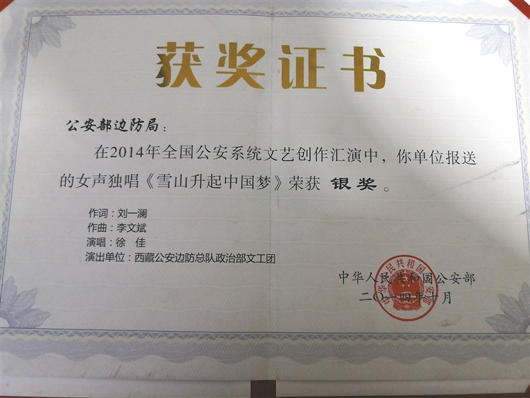 作为武警西藏公安边防总队的一员,她的军旅根基建在拉萨。而调入位于拉萨的武警西藏公安边防总队政治部文工团并担任声乐队队长,则真正将她置于了艺术与使命的熔炉。她的舞台,从拉萨延伸至西藏的千里边关。那些在边防哨所、在巡逻路上为战友们唱响的《喜马拉雅卫士》《士兵情怀》,声音里不仅有年轻人的热忱,更逐渐沉淀自这片土地的厚重。她的付出与才华,也收获了最初的认可——在部队期间荣获两次三等功及多次嘉奖;2009年,她演唱的《老西藏》在公安部“为祖国放歌”汇演中荣获铜奖,这是对她军旅艺术起点的有力肯定。