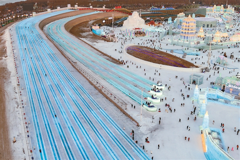 12月17日上午10时,第二十七届哈尔滨冰雪大世界正式开园迎客。园区占地面积达120万平方米,总用冰用雪量突破40万立方米,以历届之最的规模,打造一座冰天雪地的“童话世界”。图为12月17日,游客在哈尔滨冰雪大世界园区体验“超级冰滑梯”(无人机照片)。新华社记者 谢剑飞 摄