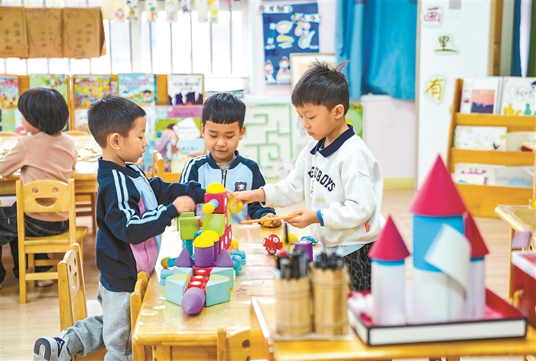 图为12月19日,在山东省乐陵市天和嘉园幼儿园,小朋友在进行建模游戏。