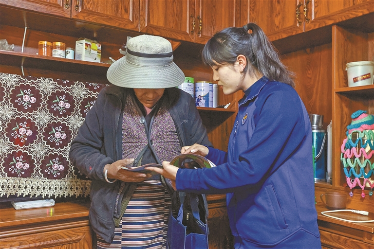 图为岗拉美朵女子双语志愿服务队开展“敲门入户”行动。本报记者 王香香 见习记者 土旦仁青 摄