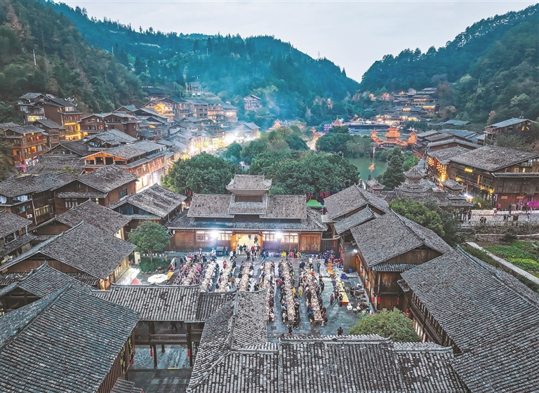 图为在贵州省黎平县肇兴侗寨,侗族同胞与来宾在侗年活动中共享长桌宴(12月20日摄,无人机照片)。