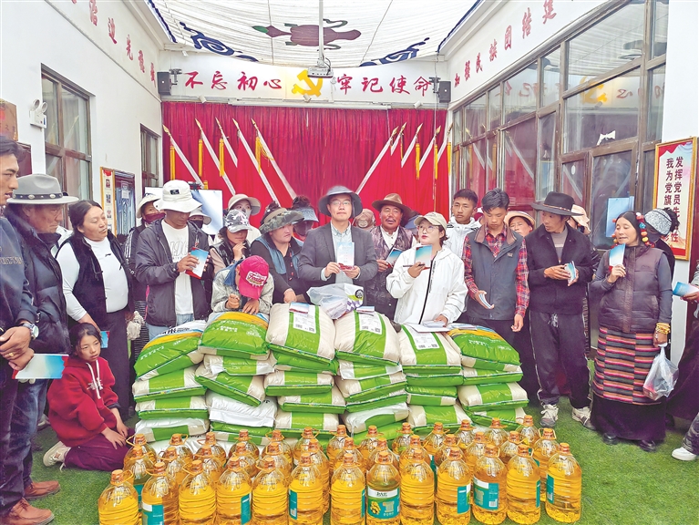 ?图为驻村工作队为牧民群众宣讲《西藏自治区农牧民享受财政补助优惠政策明白卡(2025年版)》,并发放慰问品。