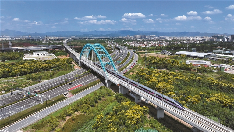 图为2024年9月6日,杭温高铁正式开通运营。这是列车行驶在杭温高铁浙江省义乌市境内(无人机照片)。新华社发(吕斌 摄)