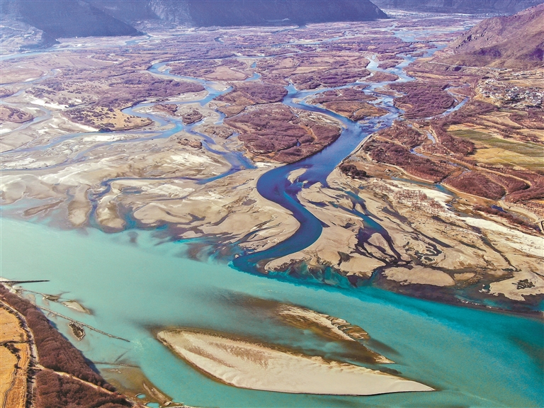 冬日的雅鲁藏布江,渚清沙白、色彩斑斓,江水宛如打翻了调色盘的画布,是高原生态之美的灵动展现。在雅尼湿地,尼洋河的碧流撞进雅鲁藏布江的清波,澄澈的蓝绿主色调在河道中晕染开来,深浅交织的水色勾勒出蜿蜒的“水脉”,浅滩沙洲如白玉雕琢的游鱼,静静“浮”在碧波间,将江面涂抹成一幅流动的水彩画。