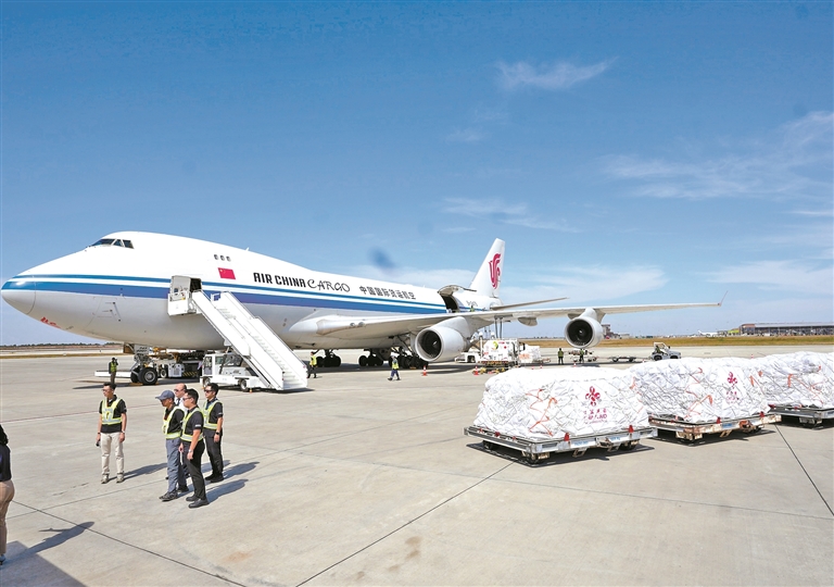 图为12月28日,首批中国援柬埔寨紧急人道主义物资运抵柬埔寨金边德崇国际机场。