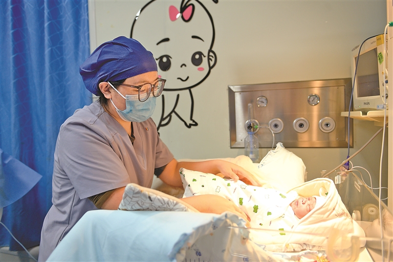 上图:1月1日,自治区人民医院妇产科助产医生次拉在包裹新生儿。本报记者 潘多 摄