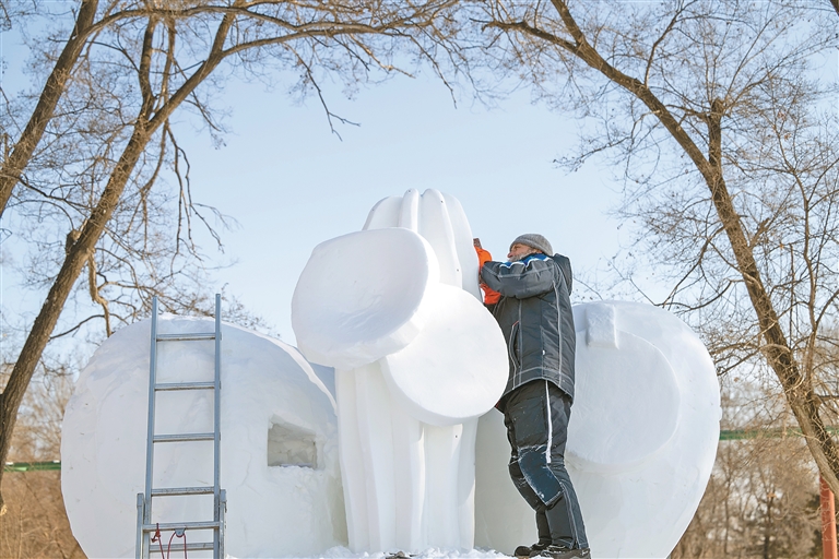 1月7日,在哈尔滨太阳岛雪博会园区,来自13个国家的25支代表队百余位艺术家在寒冬中坚持艺术创作,精雕细琢雪雕作品。