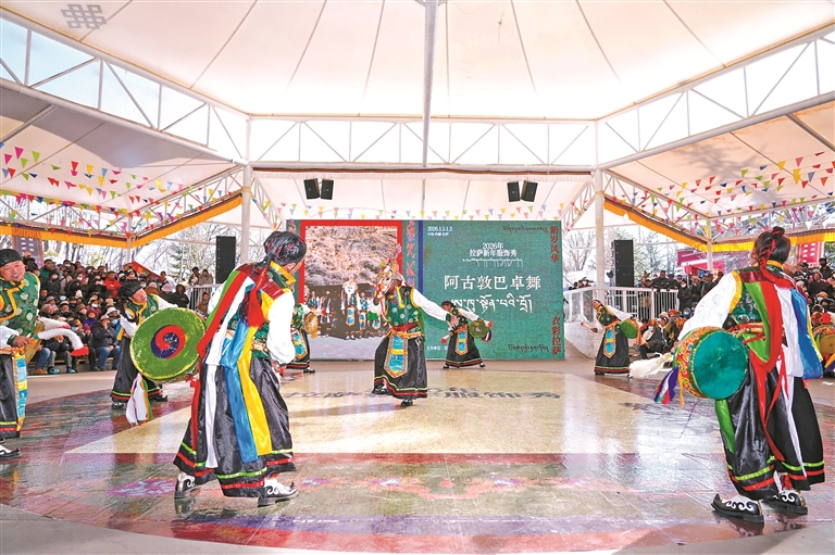 图为2026拉萨新年服饰秀拉萨农牧民妇女代表“村T秀”宗角禄康公园活动现场。