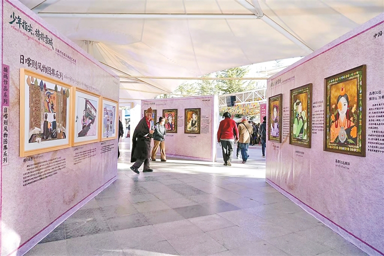 图为市民游客在宗角禄康公园驻足观赏“旖旎雪域”主题班珠丹塔服饰作品与插画艺术展。