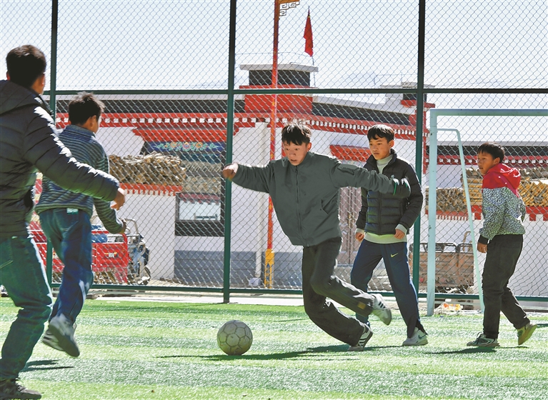 下图:定日县长所乡森嘎村的孩子们正在新建的足球场踢足球。本报记者 旦增兰泽 摄