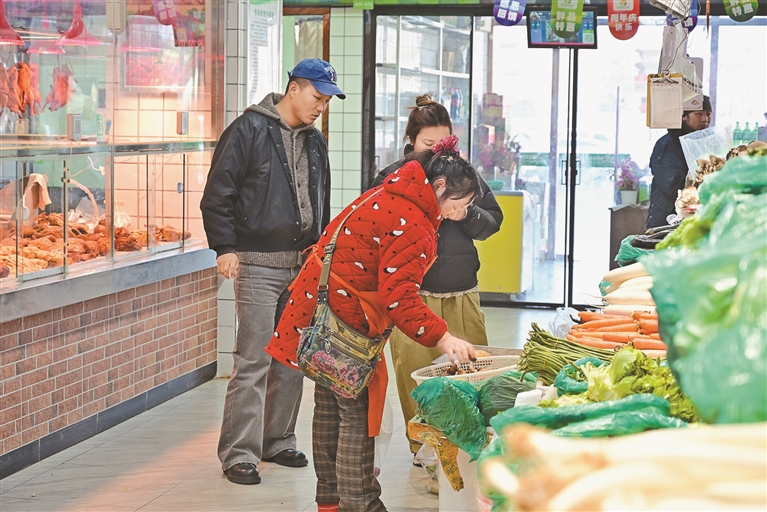 图为城关区贡布堂综合农贸市场内市民正在购买蔬菜。