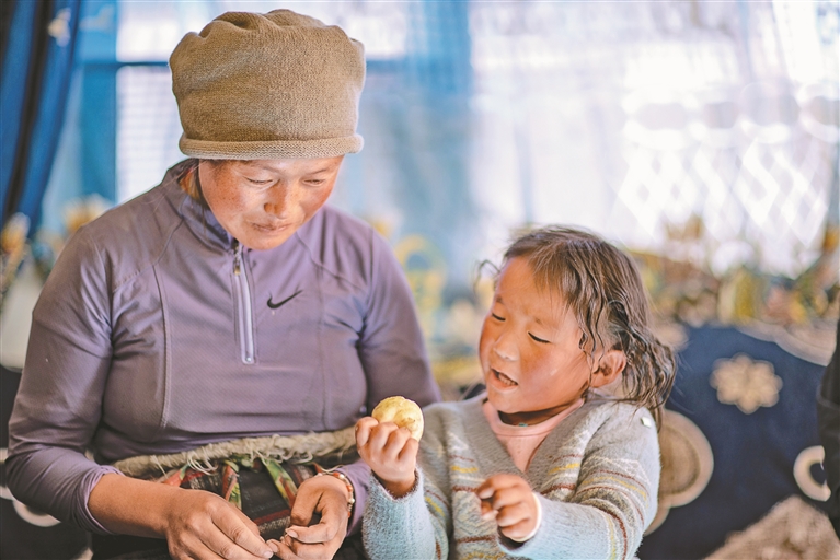上图:次仁拉姆在新居中陪大女儿玩耍。