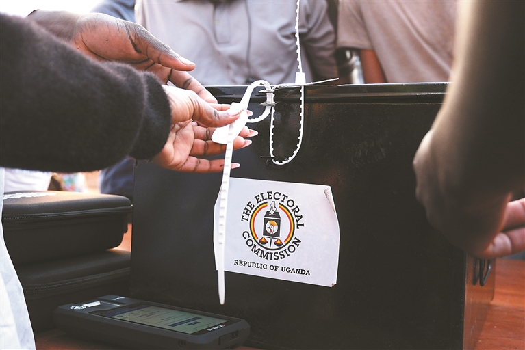 图为1月15日,在乌干达首都坎帕拉一处投票站,工作人员查看票箱密封条。新华社发(阿佳拉·纳瓦达 摄)