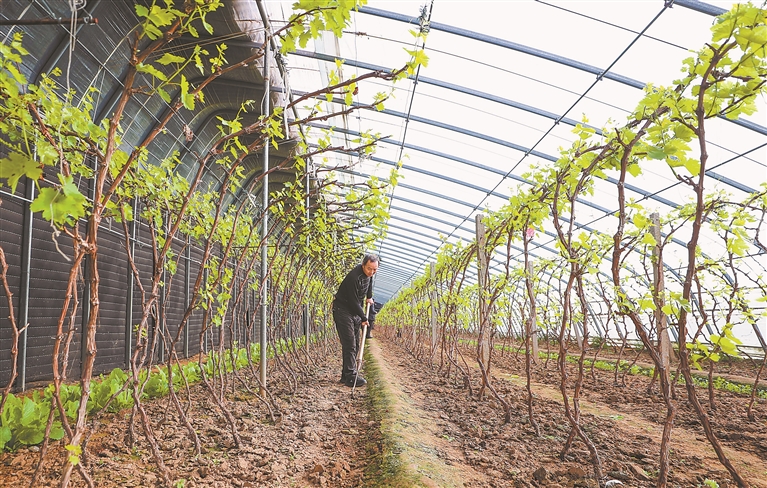 图③:图为1月20日,河北省唐山市海港经济开发区王滩镇农民在葡萄大棚松土。