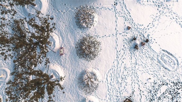 1月20日是大寒节气,多地迎来降雪,图为1月20日,游客在河南省商丘市日月湖景区赏雪游玩(无人机照片)。新华社发(李恒 摄)