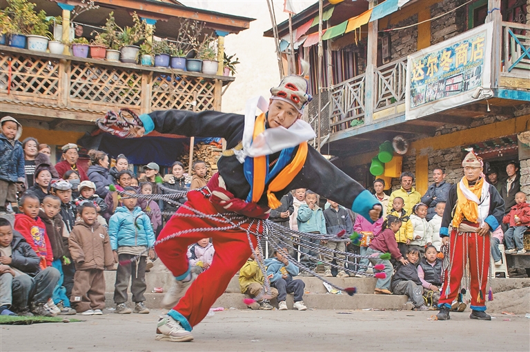 图为演职人员在表演夏尔巴玛尼戏。