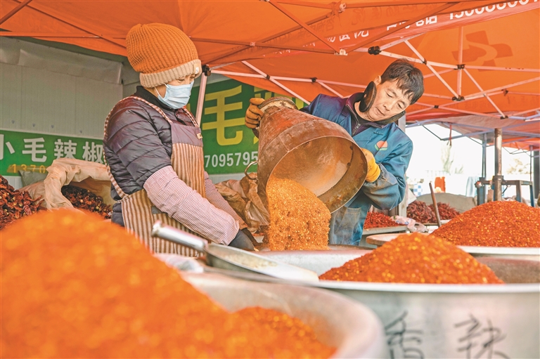 1月21日,商户在金贵大集制作辣椒面。新华社记者 杨植森 摄