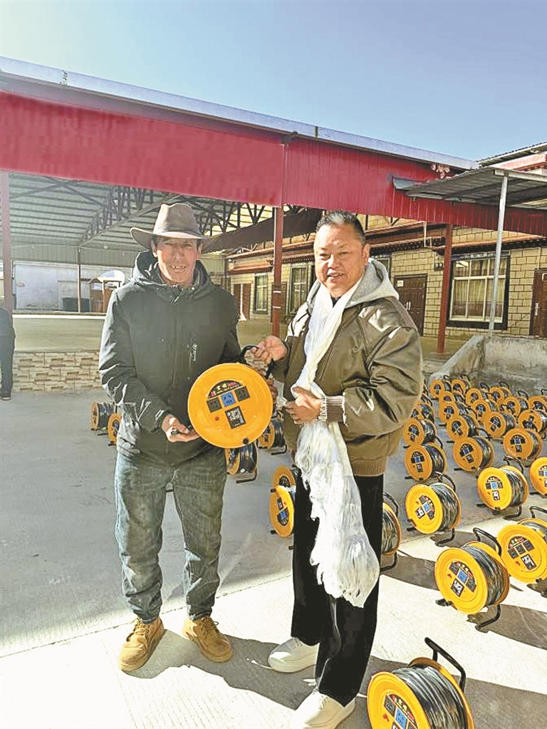 为切实保障堆龙德庆区古荣镇巴热村133户村民在春节、藏历新年期间用电安全,驻村工作队为村民发放具有漏电断路保护功能的电缆盘,为节日期间用电筑牢安全防线。 图为驻村工作队队员与村民交接电缆盘。本报记者 拉巴桑姆 摄