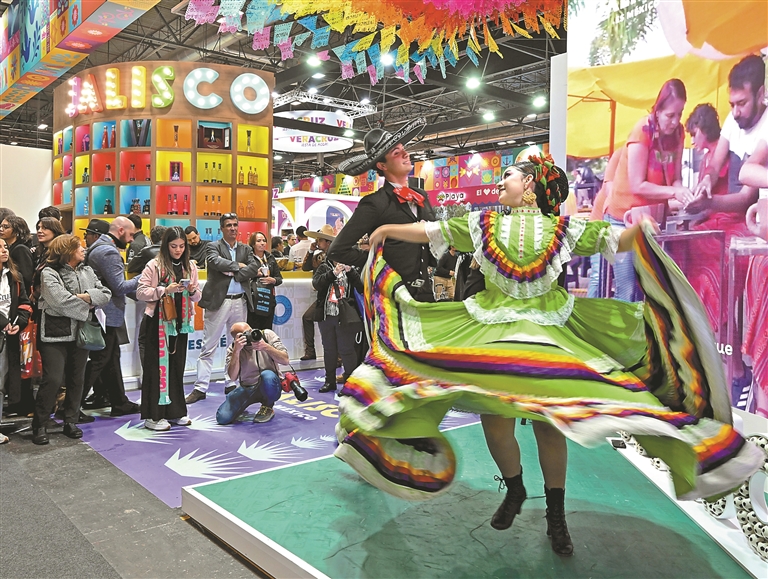 图为1月21日,在西班牙马德里,演员在旅游展上表演墨西哥传统舞蹈。