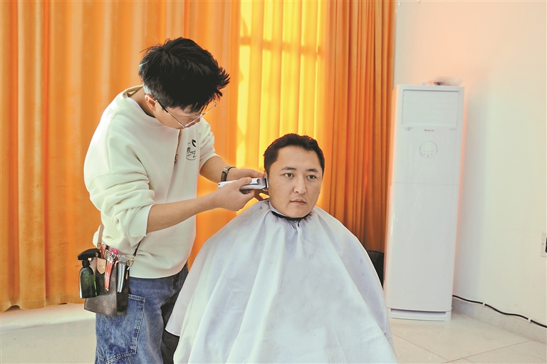 图为志愿者为雪社区居民提供理发服务。