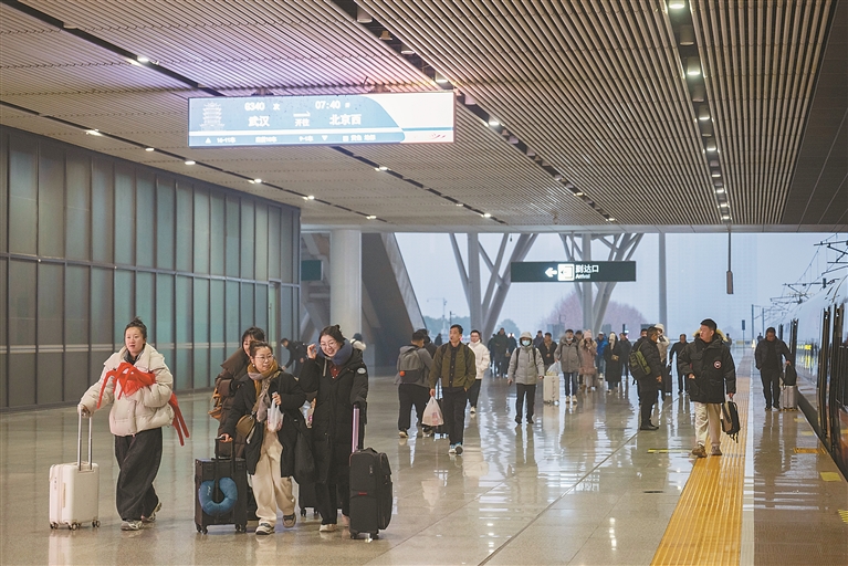 图为1月26日,旅客登上G340次列车。当日,武汉至北京西G68次车次改为G340次。