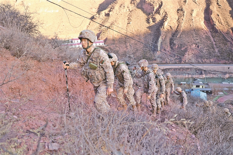 近日,为锤炼官兵高寒山地作战硬功与坚韧意志,西藏军区某部组织开展高原登山训练。图为训练现场,官兵们手持登山杖,在崎岖陡坡上稳步攀登。周建文 周楚竣 摄