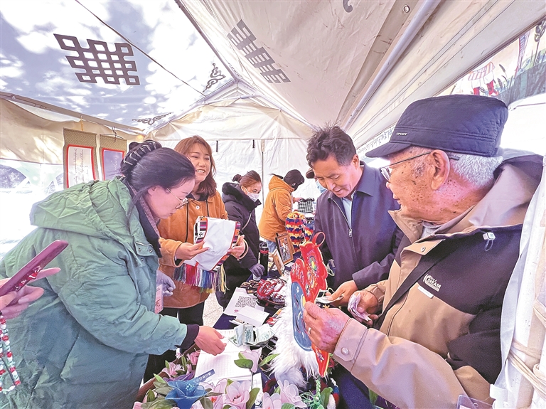 ▲市民群众在选购残疾人手工艺品。本报记者 央金 摄