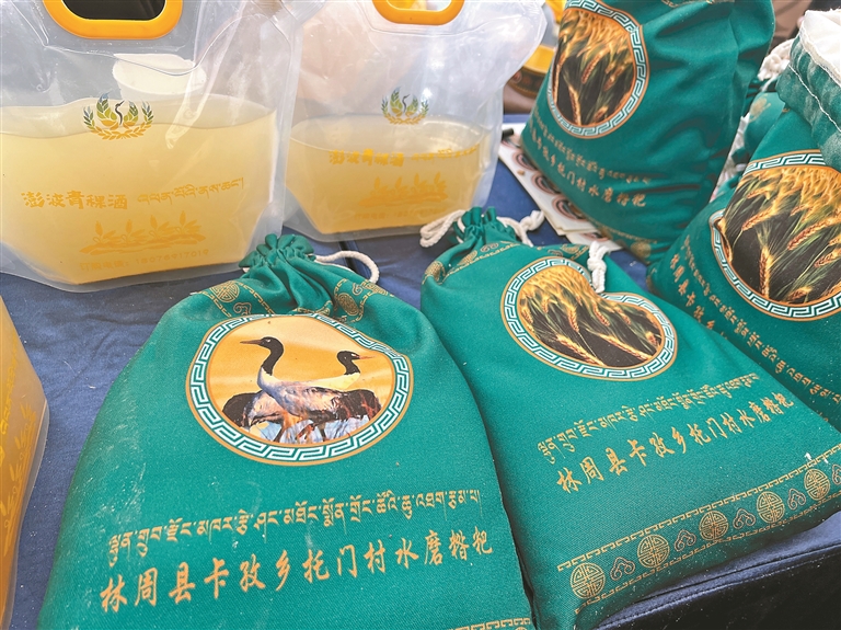 ▲林周特产青稞酒和水磨糌粑。本报记者 央金 摄