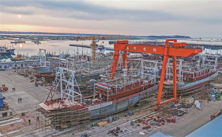 图为1月28日,在山东省荣成市石岛管理区海工装备产业基地,船舶在维修中(无人机照片)。