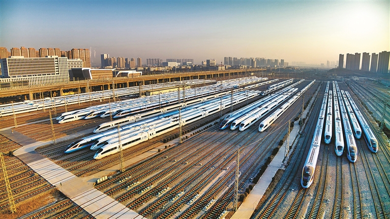 春运大幕即将拉开,中国铁路西安局集团有限公司西安动车段内,高铁动车组静候待发。