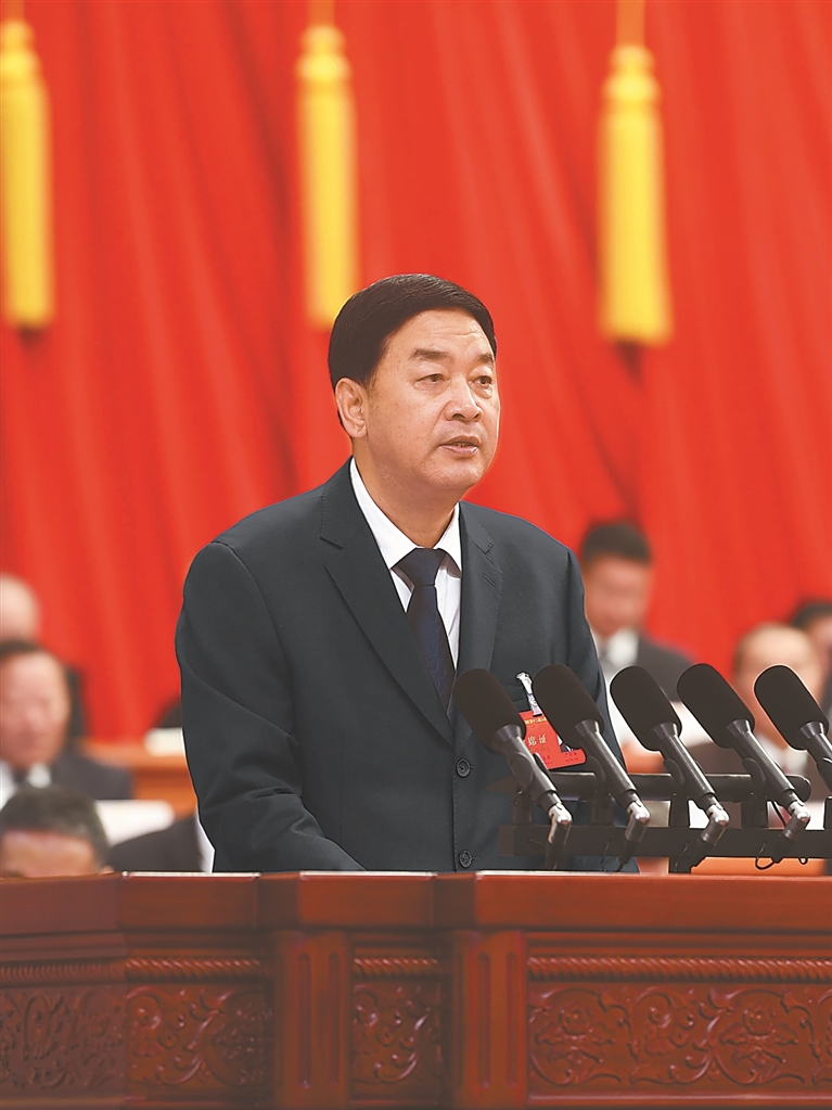 受自治区人大常委会委托,自治区人大常委会主任严金海向大会作自治区人大常委会工作报告。他说,2025年是西藏发展史上具有里程碑意义的一年。习近平总书记亲临西藏视察、亲致重要回信、亲作重要指示,在全区范围内极大振奋了民族精神、激发了爱国热情、凝聚了奋斗力量。自治区党委团结带领全区各族人民,坚定拥护“两个确立”、坚决做到“两个维护”,高质高效完成自治区成立60周年大庆活动和定日6.8级地震灾后恢复重建“两件大事”,圆满收官“十四五”,科学谋划“十五五”,推动社会主义现代化新西藏建设迈出新的坚实步伐。一年来,自治区人大常委会始终紧跟党中央重大决策部署和自治区党委工作要求,紧扣治边稳藏的实际需要,紧贴人民群众的呼声期盼,聚焦“四件大事”聚力“四个创建”,依法履职、担当尽责,各项工作在守正创新中提质增效、在服务大局中彰显作为,推动全过程人民民主西藏实践不断取得新成绩、实现新发展。