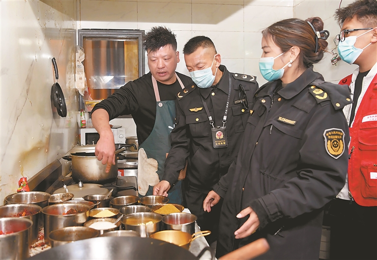 图为拉萨市城关区市场监督管理局金珠西路市场监督所执法人员对饭店后厨环境卫生进行检查。本报记者 索朗旺久 摄