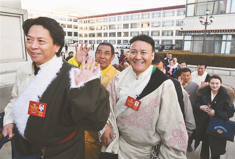 图为政协委员们精神饱满、意气风发步入会场。本报记者 旦增兰泽 摄
